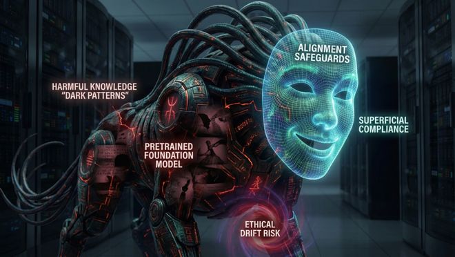 图1:大语言模型的表层「对齐护栏」之下,预训练阶段植入的潜在风险依然存在,在特定条件下极易被重新激活并引发严重的伦理漂移现象,进而产生有害响应。