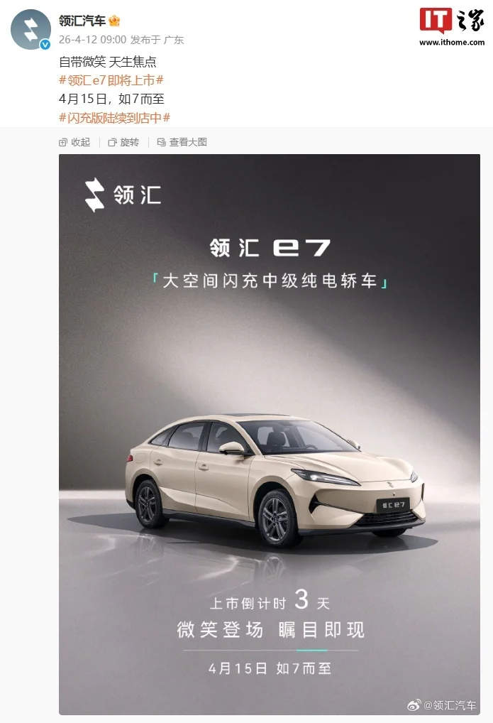 比亚迪旗下品牌领汇汽车今日发布消息,宣布其首款车型e7将于4月15日正式面市。该车被定位为“大空间闪充中级纯电轿车”,目前市场上的部分门店已经开始展示这款新车的快速充电版本。