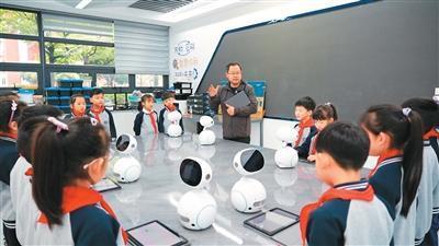 浙江省金华市金东区实验小学的AI创客教室里,老师们利用人工智能教育机器人进行项目课程的教学活动。