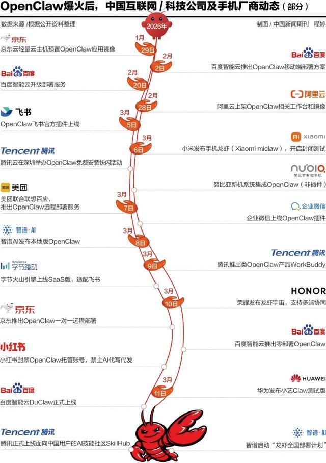 自3月初以来,包括腾讯、阿里、字节跳动、百度、京东、网易在内的多家互联网巨头相继推出各自的部署方案,并发布了基于OpenClaw的本土化“龙虾”产品。例如,腾讯和百度都推出了“养虾全家桶”。此外,小米、华为等硬件制造商也开始涉足这一领域。