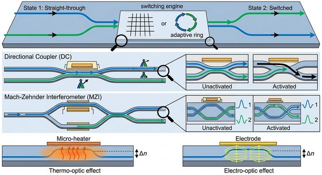 它类似于在铁路网络中部署了一套智能道岔系统,光列车无需进站停车,直接切换轨道方向,保持高速直通状态。虽然维持这个“道岔”系统的运行仍需要能量,但与O-E-O转换相比,其能耗显著降低,理论上可以达到fj/bit的量级。