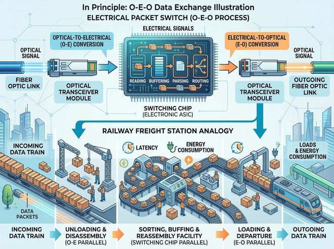 整个过程依赖于“光-电-光”(O-E-O)的转换与电子交换芯片完成数据处理。光模块负责光信号和电信号之间的转换,而交换芯片则负责读取、缓存与路由。