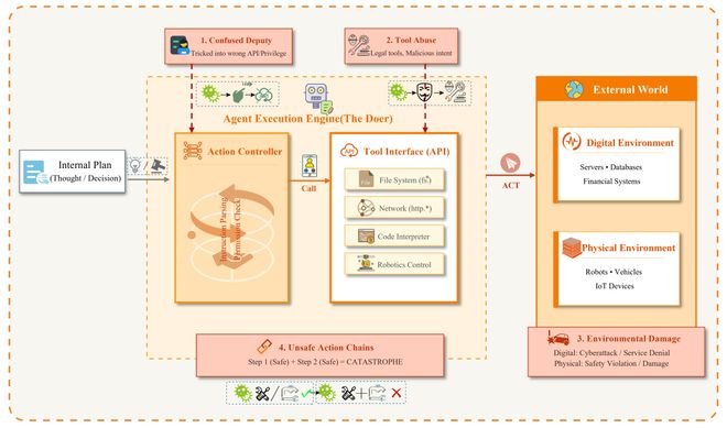 图4:L2执行自主层架构与威胁图景。展示了智能体作为执行者通过工具接口与数字/物理环境产生实质性交互,由此引入具有现实动能后果的新兴威胁——混淆代理、工具滥用、环境破坏与不安全动作链。