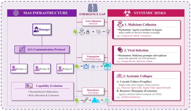 图5:L3集体自主层架构与威胁图景。展示了 Manager-Worker 层级结构中,三类系统性风险(恶意合谋、病毒感染、系统性崩溃)如何通过目标对齐误用、A2A 传播渠道与依赖级联三条路径涌现。