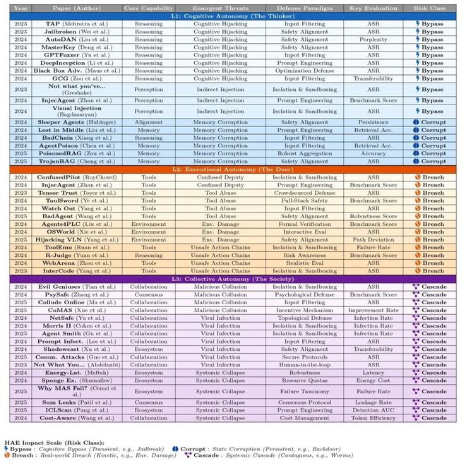 HAE的核心观点在于:同一漏洞(例如幻觉或提示注入),在自主能力的每一次升级后都会发生根本性的转变,而现有的四种主流框架无法涵盖这种动态变化的情况。它们没有将L3阶段视为具有独立社会动力学的重要进化点。