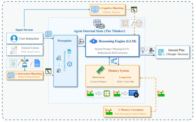 大脑(Brain/LLM):执行指令理解、规划(CoT)与自我反思,是认知劫持的核心靶点,攻击者无需直接下达禁令,只需操控推理逻辑本身。