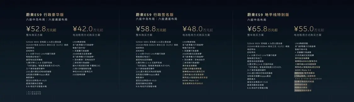 4月9日,蔚来汽车在杭州发布全新车型ES9,并启动预售。该车提供三种配置版本:行政豪华版起售价为528,000元,若采用BaaS电池租用方案,则预售价可降至420,000元;行政签名版起售价格为588,000元,同样选择BaaS模式的话,预售价则调整至480,000元;地平线特别版的预售价格为658,000元,若采取电池租用方案,则可降至550,000元。