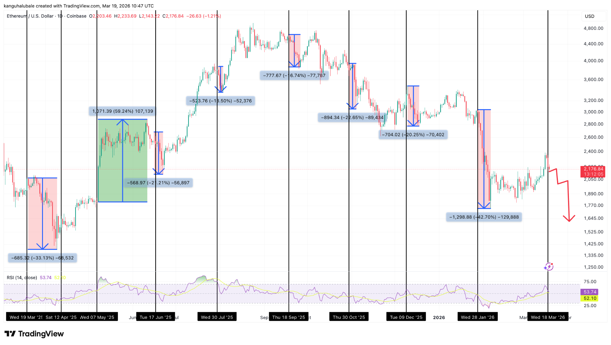 以下图表显示,在过去八次FOMC会议中,有七次会议结果公布后,ETH/USD价格出现下跌,这凸显了宏观因素主导的历史价格回调模式。