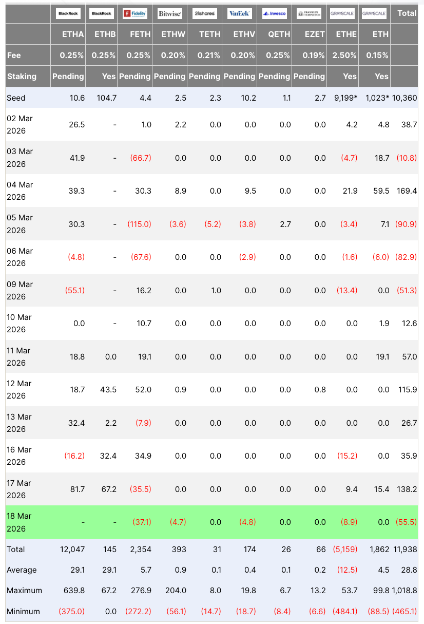 Farside Investors的数据显示,ETH价格下跌期间,美国现货以太坊ETF出现了资金净流出,周三流出金额为5550万美元,结束了连续六日的资金净流入趋势。