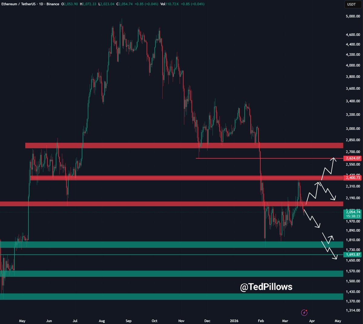 分析师Ted Pillows周一在X平台上表示:“$ETH未能突破2100美元的门槛,目前正面临下行压力。”