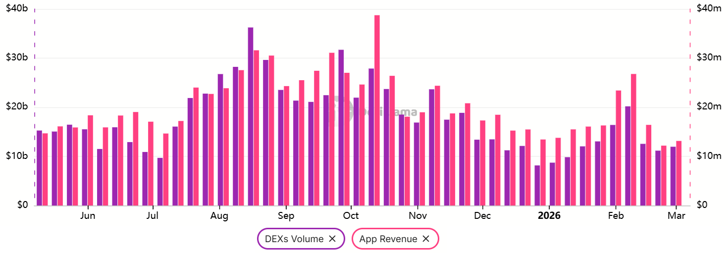 最近一周内,与一个月前相比,以太坊网络上的去中心化交易所交易量降至了126亿美元,而去中心化应用的七日收入则下滑至1410万美元。Solana链上的去中心化交易所交易量也出现了类似的下降趋势。