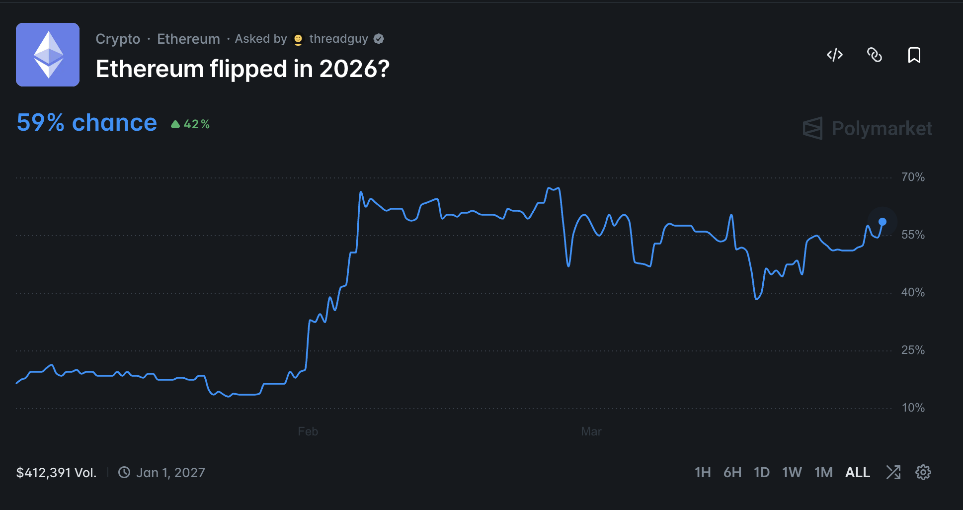 例如,在Polymarket博彩平台上,超过59%的参与者下注认为ETH将在2026年失去第二名位置。年初时,这一概率仅为17%。
