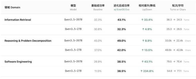 在软件工程维度,27B 模型的基础成功率(11.5%)不到 397B 模型(26.9%)的一半。然而经过 EverOS Skills 进化后,27B 直接追平了 397B + EverOS 的满配表现(均为 38.5%)。这意味着在特定场景下,为小模型配备高质量的记忆进化能力,性价比远高于单纯堆叠参数量。