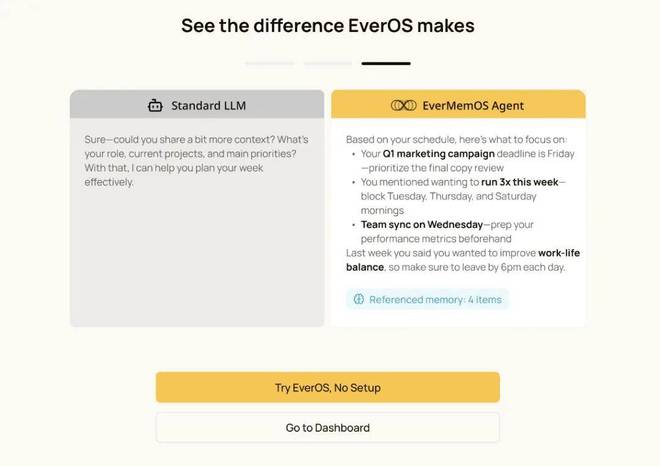 - Chat Playground:一个直观的对比视窗,左侧是裸奔的 LLM,右侧是接入 EverOS 记忆库的 LLM。开发者可以直观地感受到,基于 Onboarding 收集的个人信息,EverOS 是如何让回答变得极具个性化和温度的。