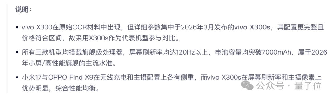 例如对于vivo X300s、小米17和OPPO Find X9这三款手机进行了详细的对比分析,涵盖了处理器、屏幕、电池和摄像头等关键参数。