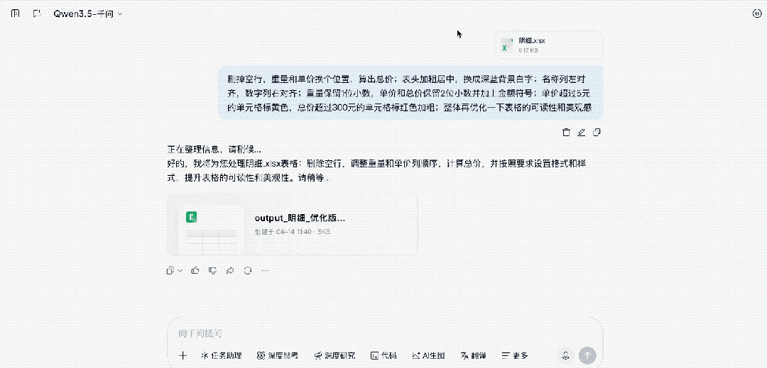 现在好了,只需将表格上传到千问并用口语化语言提出你的要求即可完成任务。