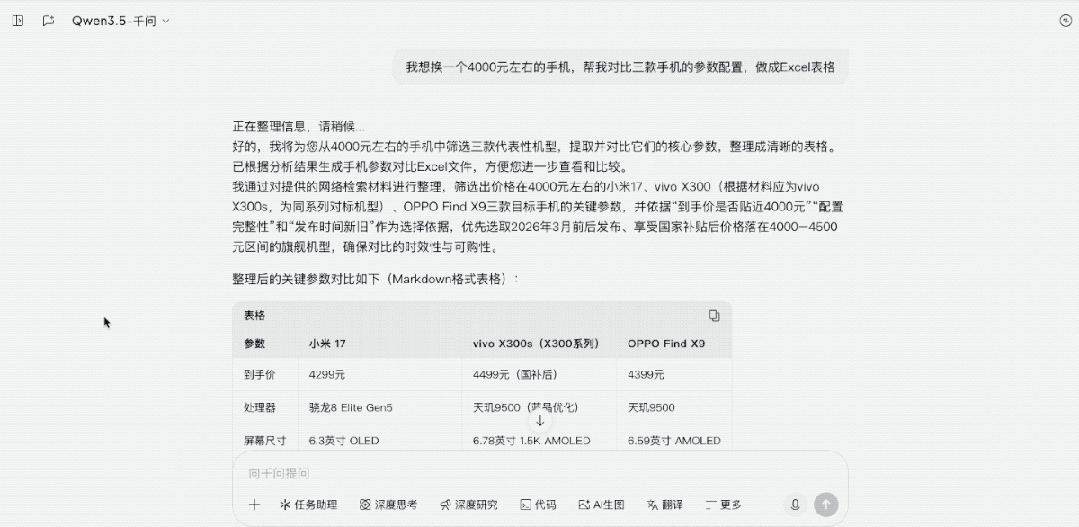 现在只需告诉千问:“我想更换一部价值4000元左右的手机,请帮我列出三款机型的具体配置,并制成表格。”
