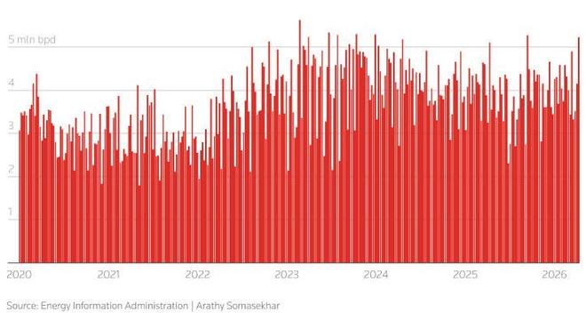 根据Kpler的数据分析,预计四月和五月期间,美国原油的日均出口量将分别达到约544万桶和548万桶,这将是历史上的最高水平,并且明显高于战争爆发前的平均水平(1月份日均394万桶,2月份则为386万桶)。