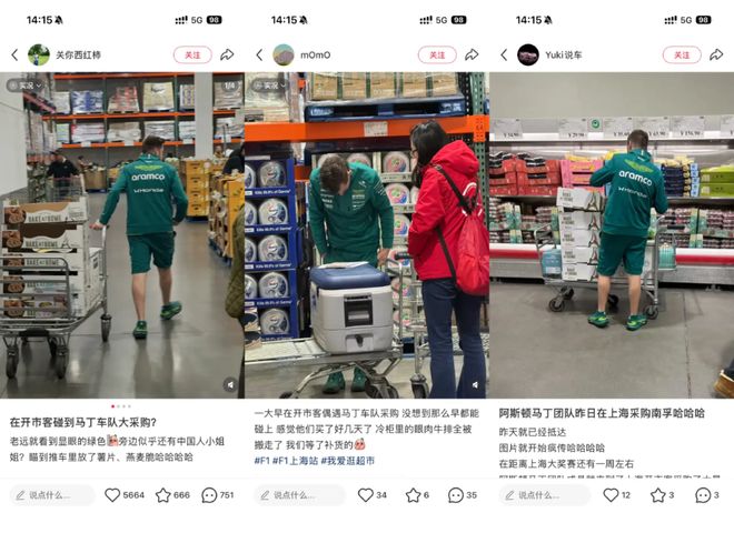 这些车手,也开始在中国获得了明星式的待遇。车手们在意大利餐馆吃饭、喝了阿嫲手作、在凯悦健身、去豫园玩, 都被实时追踪,附上粉丝合影。甚至,连阿斯顿马丁车队去开市客采购,因为是第一支在上海公开穿制服出动的车队,都被360度偷拍。