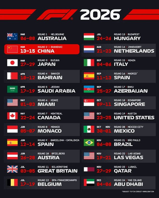 在即将到来的2026赛季中,F1总共将举办24场分站赛,从三月持续到十二月。中国大奖赛作为第二场比赛,将在上海国际赛车场举行。