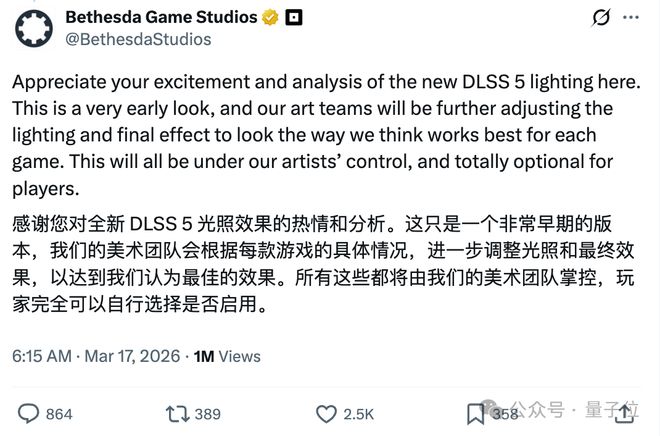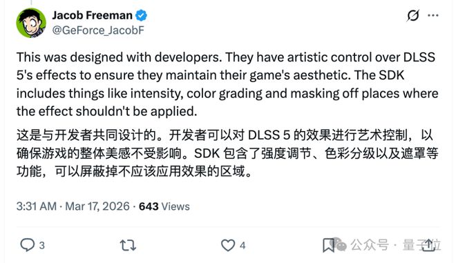 面对玩家的强烈反对,老黄表示,DLSS 5“不会改变艺术控制”,开发者仍可“微调生成式AI”以匹配他们的风格。