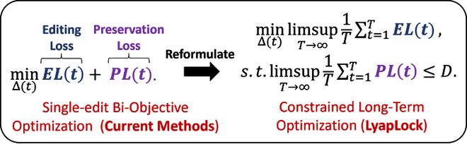 针对这一问题,中国科学院信息工程研究所的研究人员提出了LyapLock。该方法将连续编辑过程建模为一个受约束的随机规划问题,并解决了长期知识保留和渐进式性能下降的问题。
