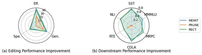 LyapLock 不仅能够独立运作,还可以与其他编辑技术相结合,进一步提升整体性能。当与MEMIT和PRUNE等现有策略结合使用时,它可以将这些基线模型的效率提高9.76%以上,并在下游任务上实现41.11%的增长(图5)。