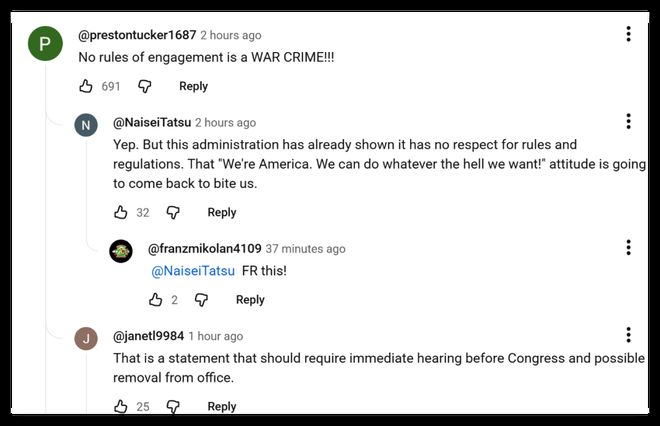 许多外国网民认为,赫格塞思所说的美国不再受制于交战规则意味着其可能将违反国际法。有人甚至讽刺说,在中东地区之前的军事行动并未带来和平与民主,因此这次美军在伊朗的所作所为可能会比以往更加恶劣。