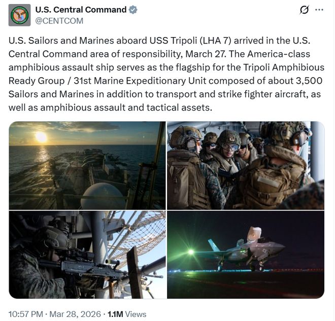 美军中央司令部28日在社交媒体上宣布,载有3500名水兵和海军陆战队员的“的黎波里”号两栖攻击舰已抵达美军中央司令部责任区。