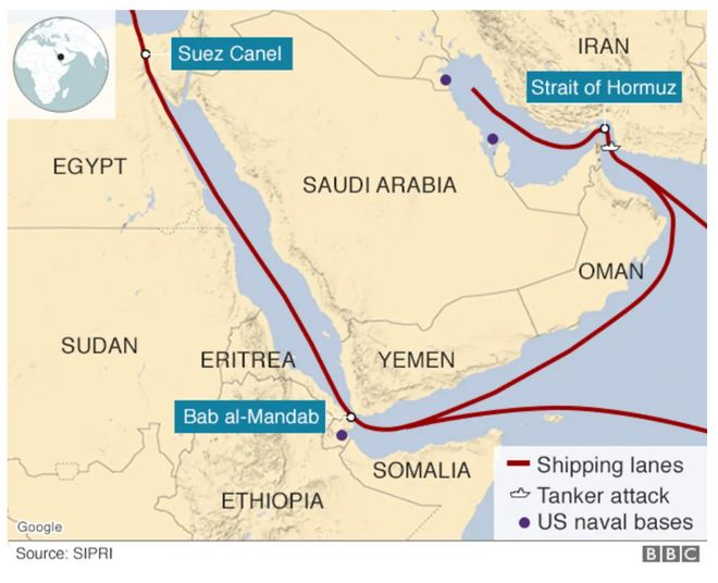 从英国广播公司(BBC)最新提供的这张图中,可以一眼看出,也门胡塞武装扼守的曼德海峡是苏伊士运河-红海航线的南出口,一旦遭受战火威胁,它与霍尔木兹海峡一起,将对中东地区的海运造成不可承受的双线打击。