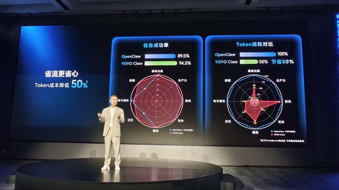 测试结果显示,在相同的任务场景下,YOYO Claw相比其他产品消耗了更少的Tokens资源。