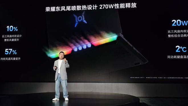 荣耀WIN游戏本业界搭载东风尾喷散热引擎,首发了离心轴流混吹系统,散热性能有显著提升,可以实现5070Ti显卡配置下整机270W的功耗释放,在业内属于头部水平。