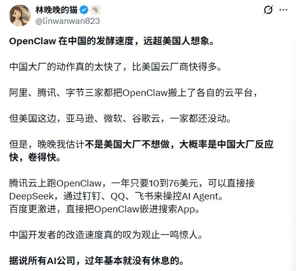 有网友观察发现,中国大厂的动作快得惊人。阿里、腾讯、字节三家都火速把OpenClaw搬上各自云平台,但美国这边,亚马逊、微软、谷歌一家都还没动。这倒不是美国大厂不想做,更大可能是中国大厂反应太快且太卷了。