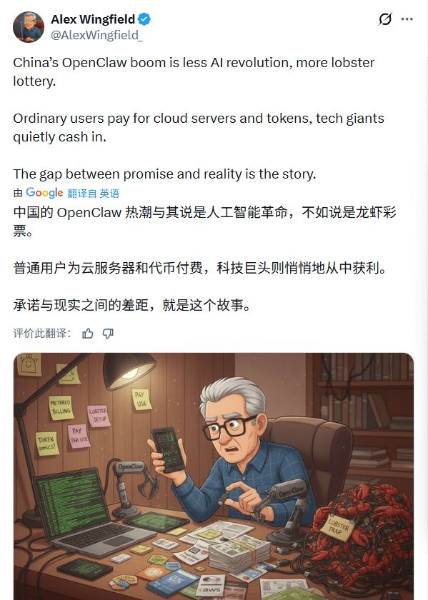 有用户直接指出,这更像是“龙虾博彩”,普通用户花钱买服务器和token,科技巨头则稳坐庄家,坐收渔利。