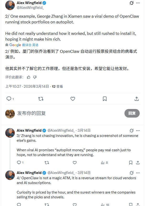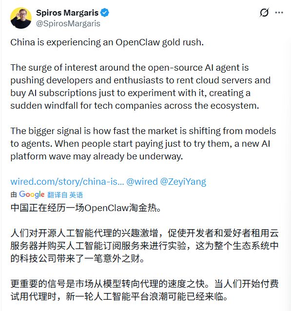 风险投资家斯皮罗斯·玛加里斯(Spiros Margaris)也注意到了这场中国淘金热。他觉得OpenClaw这波热潮的真正信号,是AI赛道正在从“拼模型”转向“拼应用”。过去大家比的是参数和跑分,现在比的是用户愿不愿意掏钱让AI替自己干活。当普通人开始为云服务器和API付费跑任务时,平台级的机会可能才刚刚开始。