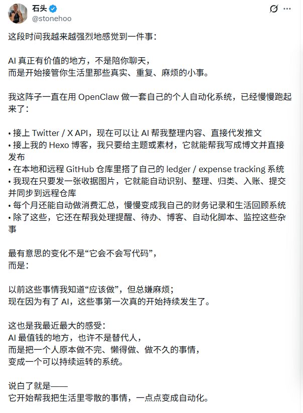 有网友分享了他用OpenClaw搭建个人自动化系统的体验:接上X和博客,AI能整理内容、代发推文、根据素材写成博文直接发布;拍张收据照片,它就能自动识别入账、归类、同步到GitHub仓库,每月还能自动生成消费汇总。提醒、待办、监控这些杂事也都交给它。