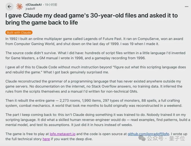 发帖者是Beamable公司的创始人兼首席执行官Jon Radoff,他利用Claude重现了一款早在三十年前就已消失的游戏——《未来往昔传奇》(Legends of Future Past)。