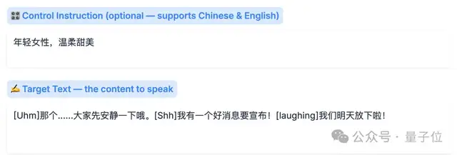 除此之外,台词中间停顿的音效,现在可以用[laughing](笑声)、[sigh](叹气)、[Uhm](嗯……)这些标签来控制: