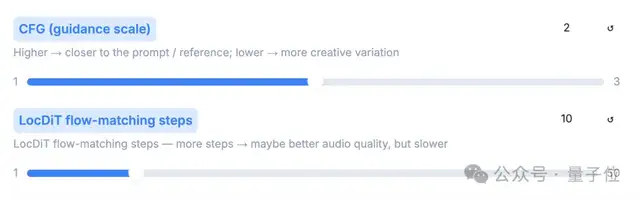 第三个就是LocDiT,设置它的步数越高,音频效果就会越好,但生成的速度就会变慢。