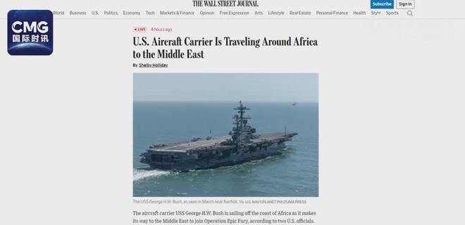 美国《华尔街日报》在当地时间13日引用美国官员的话指出,“布什”号航母现正航行于靠近非洲海域的位置,目的地为中东以应对伊朗局势。报道特别提到,该航母选择绕行非洲之角而非穿越地中海,意在避开红海区域,从而避免可能遭遇也门胡塞武装的袭击。