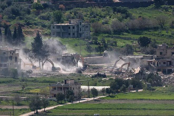 在黎巴嫩南部地区,以军挖掘机正在拆除一处建筑。