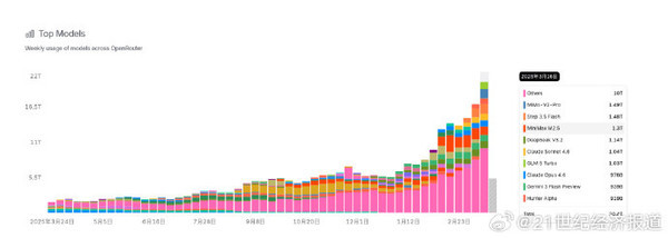 3月23日,全球大模型聚合路由平台OpenRouter发布的数据显示,过去一周(3月16日至3月22日),国产大模型的总调用量连续第三周超越美国同类产品,且领先幅度持续扩大。
