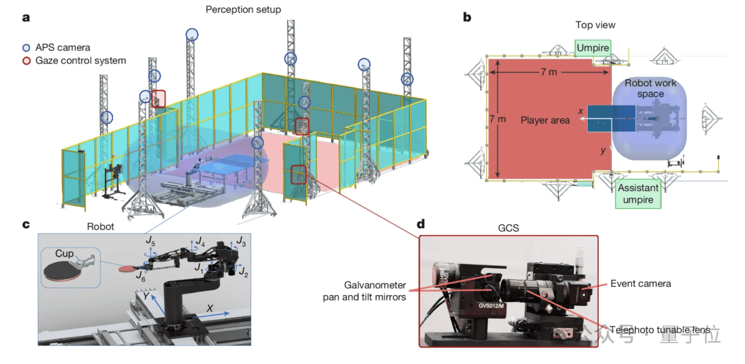 配一套叫gaze control system的装置,三块可转镜片追着球走,一颗可电控变焦的长焦镜头让球一直清晰,三套从不同角度盯球上的logo怎么翻,算出角速度。