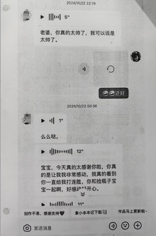 与“狐狐某某”的聊天,同样是早晚问候,日常以“老婆、宝宝”之类称呼彼此。小梦刷票后,对方会反复感谢,认识一周年的日子,对方发来“一周年快乐”。对方曾在考核期发信息求助。聊天中,小梦也曾埋怨对方“大忙人抽空才回复了我一下”。