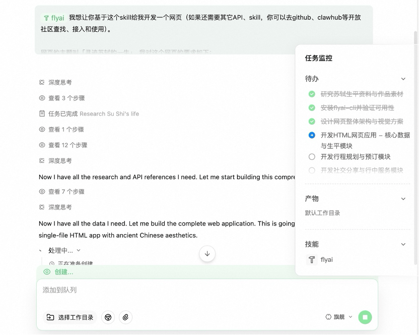 (图:网友基于“flyai”开发旅行相关应用)例如,开发者可以根据对某个地方的熟悉程度,结合“flyai”的全品类商品池,为旅行者设计出不同主题和体验的旅行产品;或者利用包括“flyai”在内的多个技能插件,为公司的每位员工定制专属的商务出行助手,包括用餐、住宿、交通以及背景调查、会议记录等;甚至还可以基于“flyai”开发出诸如“跟着塔罗牌去旅行”或“打卡唐诗宋词中的千里江山”等趣味小应用,与朋友一同分享。