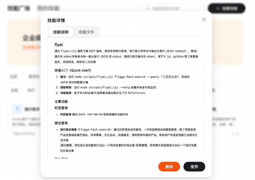 ClawHub的文档指出,“flyai”基于飞猪的MCP协议进行标准化封装,能够提供包括机票、酒店、门票、用车、目的地游玩以及机票次卡、酒店套餐在内的出行旅游商品搜索、咨询、规划及预订服务,实现了从咨询到交易的全程覆盖。“flyai”操作简便,无需在飞猪官网注册或申请API Key即可使用。