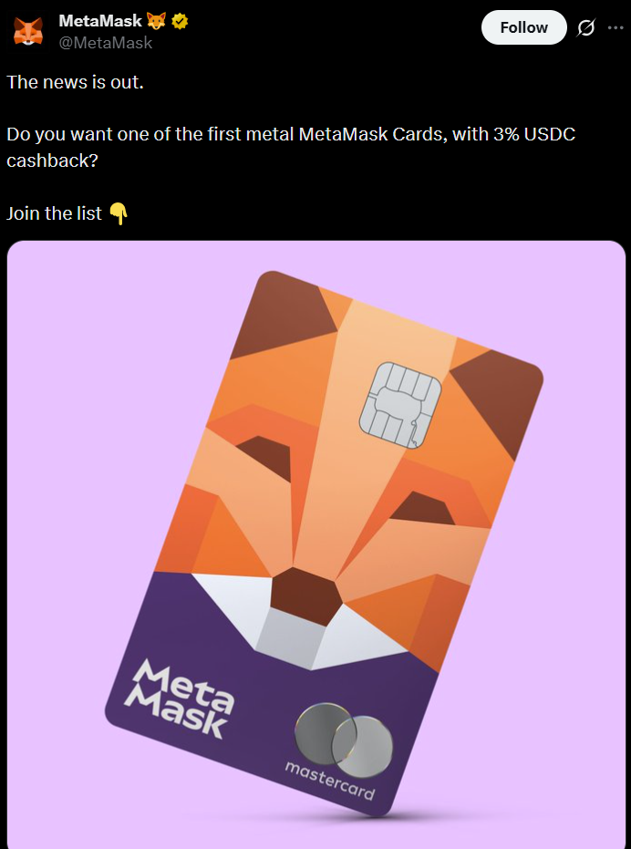 最近,万事达卡与MetaMask合作在美国市场推出了一张新的联名卡,允许用户在支持万事达卡的商家消费时自动将持有的加密货币转换成法定货币。