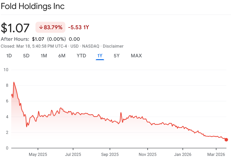 在比特币抛售的同时,Fold(FLD)的股价在2026年迄今下跌了59%,过去12个月的跌幅更是达到了83.8%。