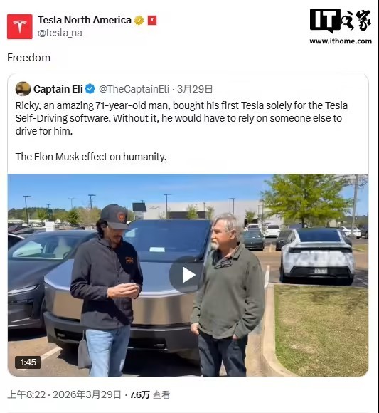 IT之家 3 月 30 日消息,据 Electrek 报道,特斯拉北美官方 X 账号转发推广了一则全新 Cybertruck 车主的采访视频。这位车主称,自己视力不断衰退,眼科医生建议他购买搭载 FSD 功能的特斯拉车型。