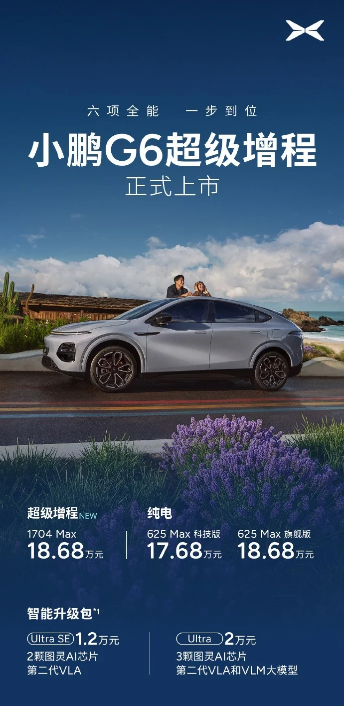 近日,小鹏汽车发布了新款G6超级增程版车型,并将其售价定为18.68万元人民币。这款新车的综合续航里程达到了惊人的1704公里,在纯电模式下可以行驶430公里。其配备了容量为55.8千瓦时的电池和一个60升的油箱,油电混合下的百公里油耗仅为2.24升,并且支持使用92号汽油。